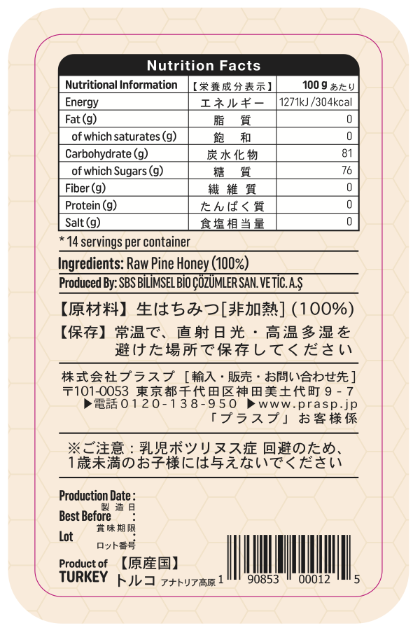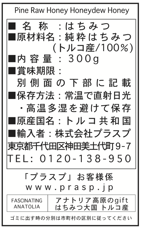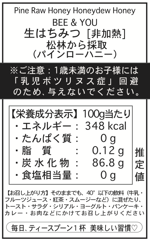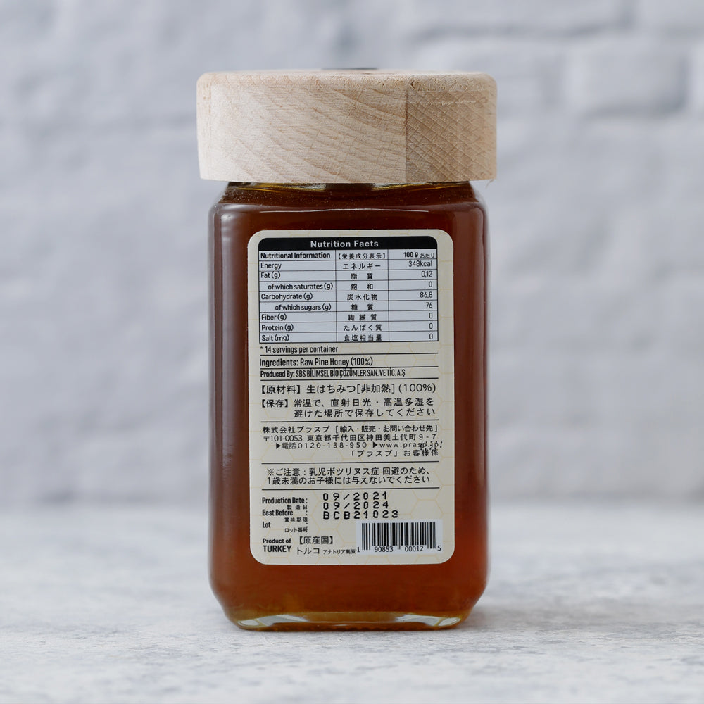 花からとれる一般的なハチミツよりも甘くなく、酵素、アミノ酸、ミネラルなどの栄養分も豊富。料理にも使いやすく、万能で美味しいのが特徴です。松の木(PINE)に寄生する虫が樹液を食べて甘露蜜という蜜を出し、それをミツバチが集めたもの。濃い琥珀色で、甘くてスパイシー、樹脂のようなウッディな香りがあります。